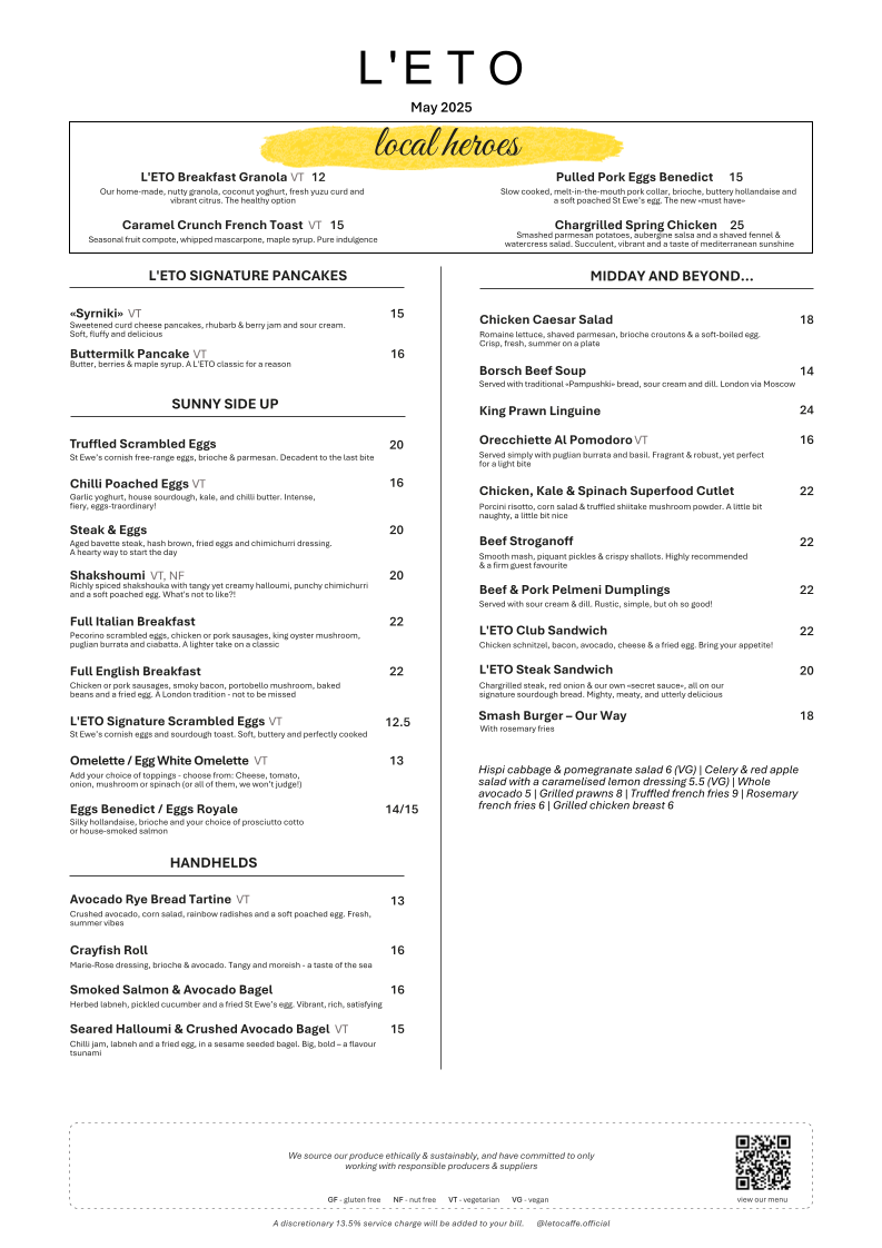 Don’t miss the signature pancakes, from sweet syrupy delights to fluffy 'Syrniki' pancakes, each dish artfully presented. Lunch options shine with the Chicken Caesar Salad and the flavorful Borsch Beef Soup, creating a delightful experience for midday diners. Reviews rave about the welcoming atmosphere and attentive service, ensuring each visit is memorable. Whether you're here for a cozy date or a casual bite, L'ETO Covent Garden serves up warmth and exquisite flavors in every dish.